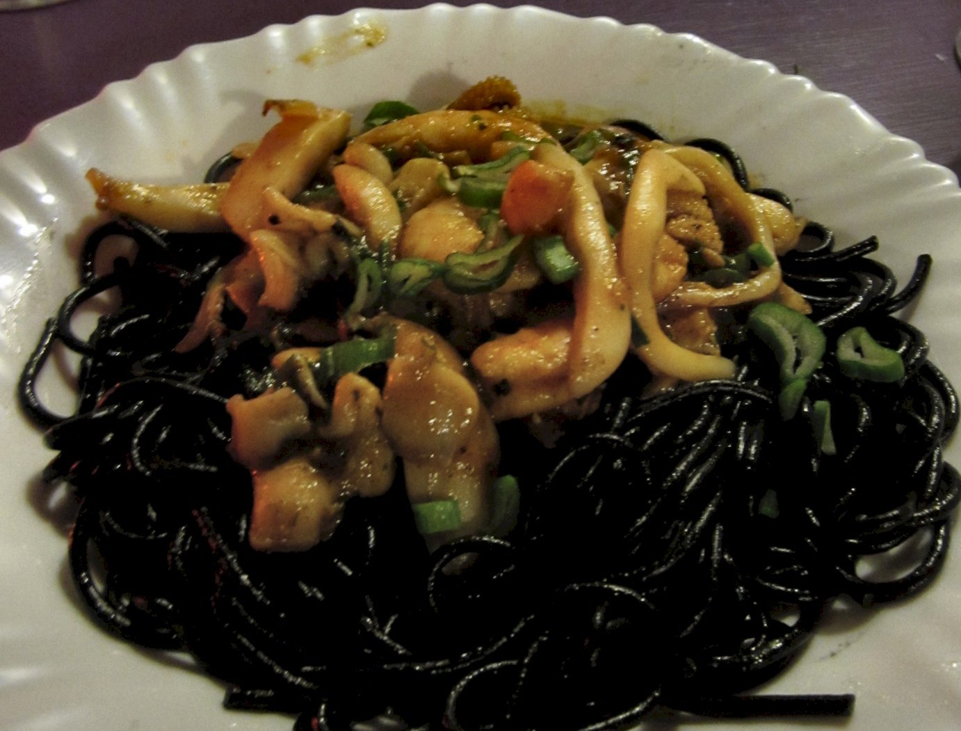 Daarna onze chocos (Sepia, inktvis) gebakken en afgeblust met het gezeefde nat van onze mosselen van die middag, wat gepelde gamba's erdoor, peterselie en daarbij zwarte pasta. Prima